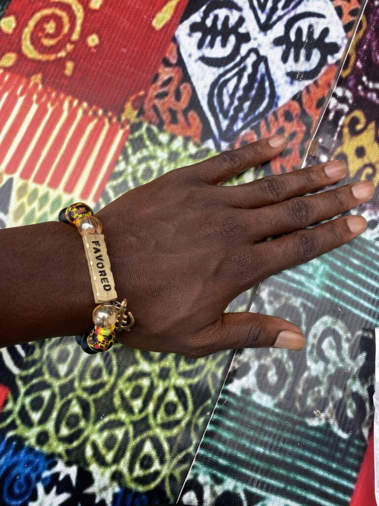 Beaded Bracelets, with the word of affirmation “Favored.”
